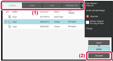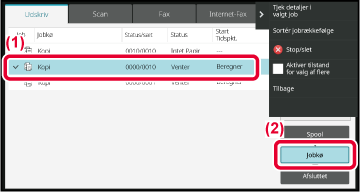 Tryk på jobstatusdisplayet, og tryk på fanen for det job, du ønsker at stoppe eller slette.