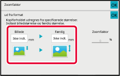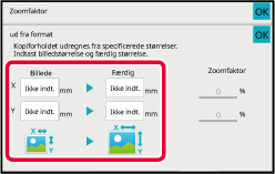 Angivelse af den ønskede zoomfaktorAngiv X- og Y-målene for billedstørrelsen samt målene for udkaststørrelsen.