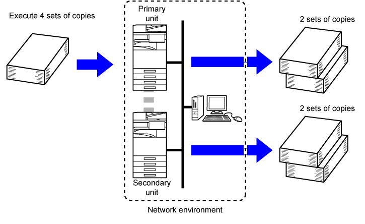 Der kan vælges op til 9999 kopier (sæt). Det angivne antal kopier deles mellem den primære og den sekundære enhed. Hvis antallet af kopier er ulige, vil den primære enhed producere flere kopier end den sekundære enhed.
