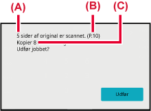 På bekræftelseskærmen vises antallet af scannede originalark i (A), antallet af scannede sider i (B), og antallet af sider ekskl. blanke sider i (C).