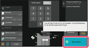 Lav kun ét sæt kopier.Kontroller kopiresultatet. Hvis der ikke er nogen problemer, trykker du på tasten [Start Udskriv].
