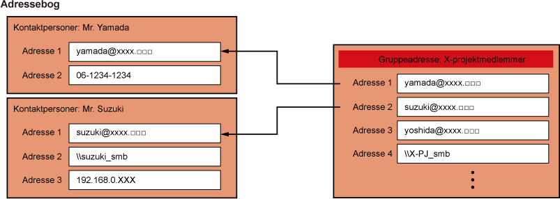 internet-fax og direkte SMTP-adresser for hver kontakt.