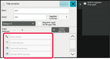 Tryk på [Faxnummer], [E-mail-adresse], [Internetfaxadresse], [Direkte SMTP-adresse],