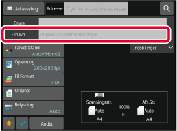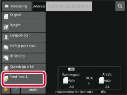 Når farvefunktionsindstillingen er [Fuld Farve] i scanningsfunktionen, vil billedet blive sendt til faxadresser i Mono2 og i farve til scanningsadresser. Hvis du vil sende billedet i Mono2 til alle adresser, skal du trykke på [Send samme billede som faxadresse] på handlingspanelet i normal tilstand. |