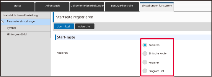 Wenn Sie auf die Taste [Übermitteln] klicken, wird der Bildschirm [Startseite registrieren] beendet.