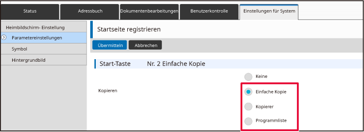 Für manche Einstellungen ist es ggf. erforderlich, Ihr Benutzerpasswort einzugeben, nachdem Sie auf [Heimbildschirm- Einstellung] geklickt haben. Wenn Sie keine Benutzerauthentifizierung ausgeführt haben, müssen Sie das Administratorenpasswort eingeben.