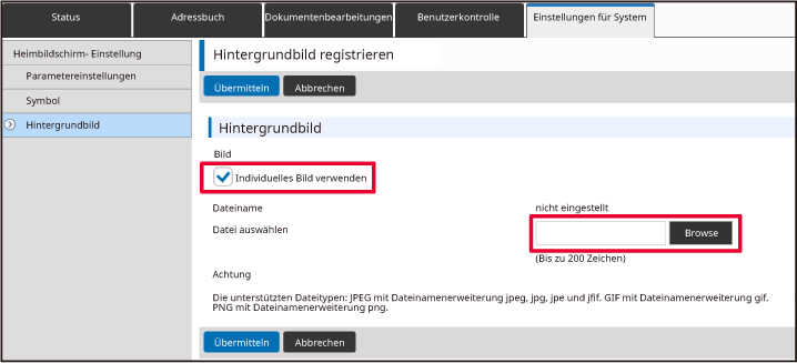 Klicken Sie auf die Schaltfläche [Browse] und wählen Sie das Bild, das hinzugefügt werden soll.Wenn Sie die Konfiguration aller Einstellungen beendet haben, klicken Sie auf die Schaltfläche [Übermitteln].