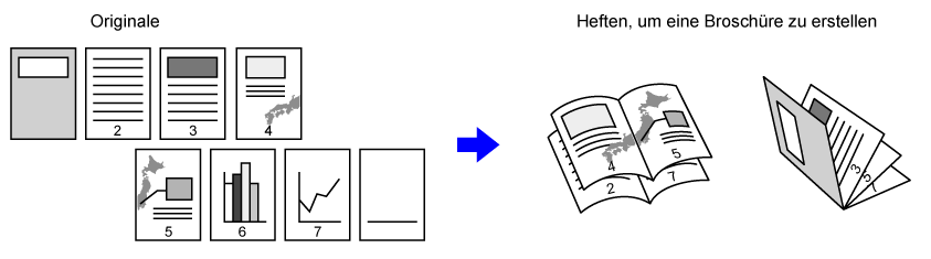 Legen Sie das Original in das Einzugfach des automatischen Originaleinzugs oder auf das Vorlagenglas.Berühren Sie die Taste [Sonstiges] und dann die Taste [Broschüre] oder berühren Sie die Taste [Heftung sort.] und dann die Taste [Sattelheftung].