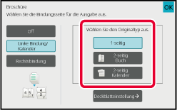 Berühren Sie abhängig vom Original die Tasten [1-seitig], [2-seitig Buch] oder [2-seitig Kalender].
