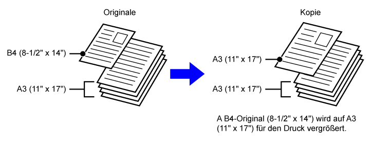 Verwenden Sie diese Einstellung für Originale mit 2 unterschiedlichen Formattypen ohne identische Seitenlänge. Diese Einstellung kann nur für die folgenden Formatkombinationen verwendet werden: • A3 und B4 • A3 und B5 • B4 und A5 • A4 und B5 • B4 und A4R • B4 und A5 • B5 und A4R • B5 und A5 • 11"x17" und 8-1/2"x14" • 11"x17" und 8-1/2"x13" • 11"x17" und 5-1/2"x8-1/2"