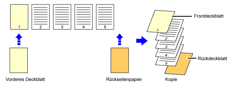 ![]() Fügt am Anfang der Kopien ein vorderes Deckblatt ein und erstellt für das Rückdeckblatt eine 2-seitige Kopie auf der fünften und sechsten Originalseite. |