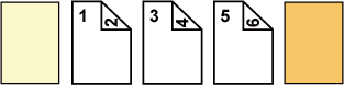 ![]() Fügt am Anfang der Kopien ein vorderes Deckblatt ein und erstellt für das Rückdeckblatt eine 1-seitige Kopie auf der sechsten Originalseite. Es wird eine 1-seitige Kopie der fünften Originalseite erstellt. |