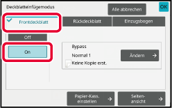 Berühren Sie die Taste [Frontdeckblatt] und anschließend die Taste [On].