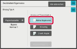 Wenn nur der Einzugsbogen A eingefügt wird, berühren Sie die Taste [Keine Kopie erst.].