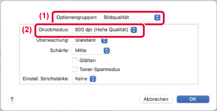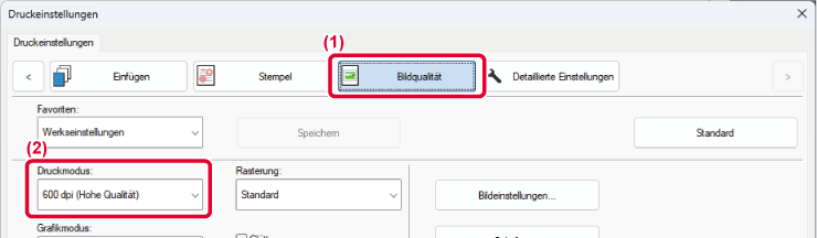 Für den "Druckmodus" (Auflösung) sind die folgenden