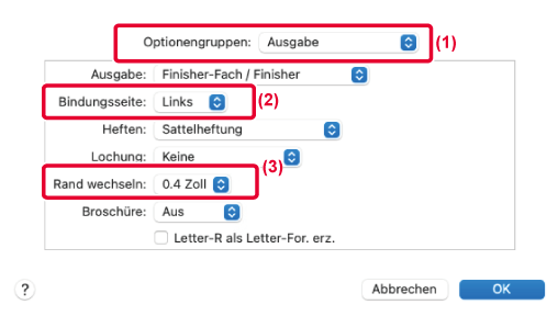 - Wählen Sie die angegebene Ausgabegröße und die Bindungsseite.