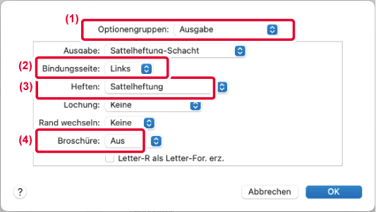 - Wählen Sie unter "Heften" die Option [Sattelheftung] aus.