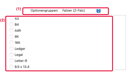 Mehrer Blätter werden gemeinsam in der Mitte gefaltet. Wenn ein Sattelheft-Finisher (Großraum) installiert ist, können eines oder mehrere Blätter ausgewählt werden. |
