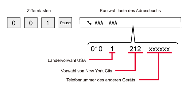 Auslandsgespräch (z. B. "001") und dem Ländercode (z. B. "81" für