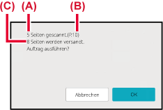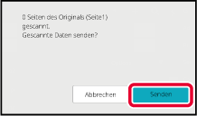 Ein Signalton weist darauf hin, dass der Scanvorgang beendet ist.Überprüfen Sie am Ende des Scanvorgangs die Anzahl der gescannten Originalblätter und die Anzahl der zu sendenden Seiten, und berühren Sie die Taste [OK], um die Übertragung zu beginnen.