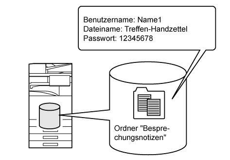 Diese Funktion speichert die Dokumentendaten auf dem lokalen Laufwerk, während ein Kopier-, Bildsende- oder anderer Auftrag ausgeführt wird. Im Gegensatz zur Offenen Ablage können verschiedene Informationen beim Speichern an die Datei angehängt werden, um eine effiziente Dateiverwaltung zu ermöglichen. Es kann auch ein Passwort gesetzt werden. |