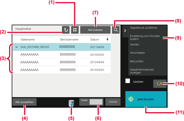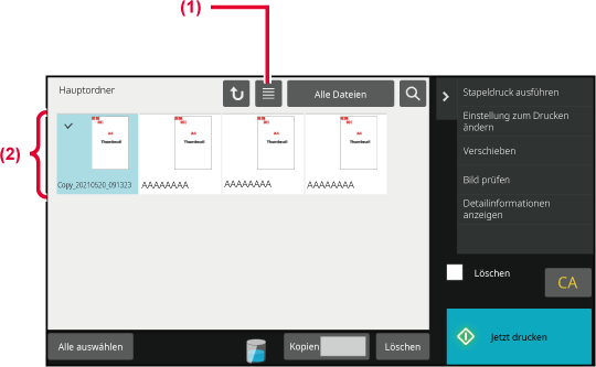 - Dient zum Aus- oder Abwählen aller Dateien. Durch Berühren
