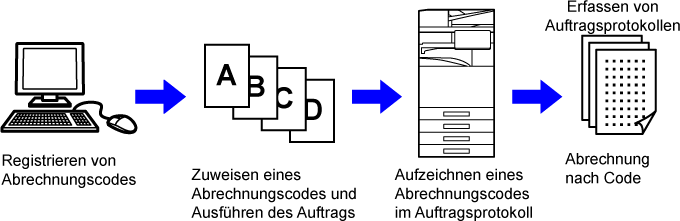 Wird verwendet zur Kategorisierung der Ergebnisse der ausgeführten Druck- und Sendeaufträge, um eine effiziente Verwaltung zu unterstützen. Beispielsweise können Sie einen Code nach Kunde zuweisen und Kostendaten nach Kunden aus den Auftragsprotokollen erfassen. Beispiel eines Codes: Herausgegeben für Unternehmen A |