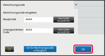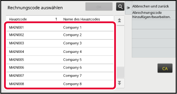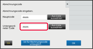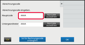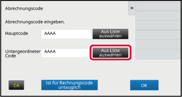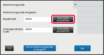 Wenn das Eingabefenster für den Abrechnungscode angezeigt wird, berühren Sie die Taste [Aus Liste auswählen] des Hauptcodes.