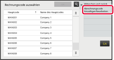 , um die Registrierung zu beenden.Wenn das Eingabefenster für den Abrechnungscode angezeigt wird, berühren Sie die Taste [Aus Liste auswählen] des Hauptcodes.