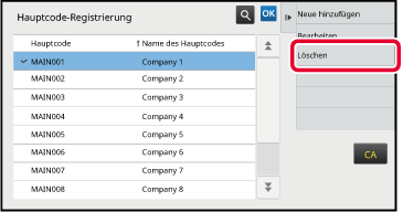 Tippen Sie den zu löschenden Hauptcode an, und tippen Sie dann im Aktionsfeld die Taste [Löschen] an.