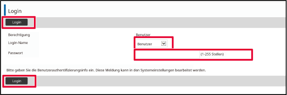 • Weitere Einzelheiten zum Anmeldevorgang bei aktivierter Benutzerauthentifizierung finden Sie unter " BENUTZERAUTHENTIFIZIERUNG".