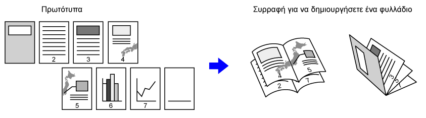 Τοποθετήστε το πρωτότυπο στον δίσκο του αυτόματου τροφοδότη πρωτοτύπων ή στο κρύσταλλο πρωτοτύπων.Πατήστε το πλήκτρο [Άλλα] και, στη συνέχεια, το πλήκτρο [Φυλλάδιο] ή πατήστε το πλήκτρο [Σελιδοπ με Συρρ] και, στη συνέχεια, το πλήκτρο [Μονάδα Καρφιτσώματος].
