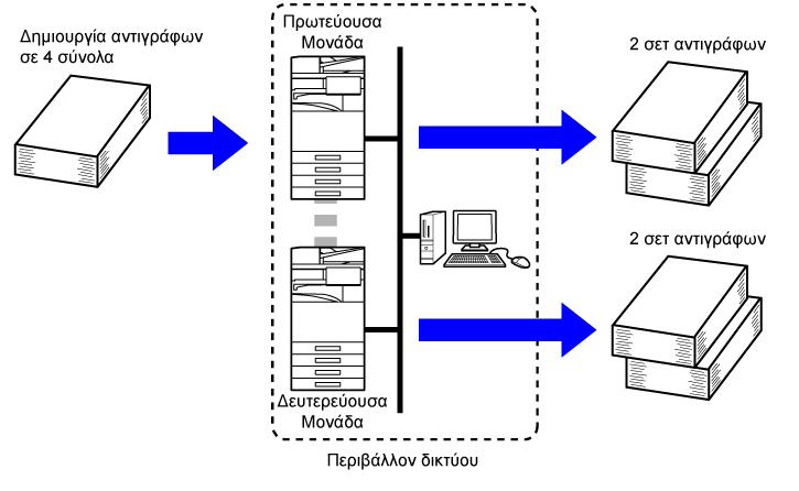 Μπορείτε να ορίσετε μέχρι 9999 αντίγραφα (σετ). Ο καθορισμένος αριθμός αντιγράφων μοιράζεται μεταξύ της κύριας μονάδας και της δευτερεύουσας μονάδας. Εάν ο αριθμός των αντιγράφων είναι μονός, η κύρια μονάδα δημιουργεί περισσότερα αντίγραφα από όσα η δευτερεύουσα μονάδα.