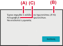 Στην οθόνη επιβεβαίωσης, ο αριθμός των σαρωμένων πρωτότυπων φύλλων εμφανίζεται στο (Α), ο αριθμός των σαρωμένων πλευρών σελίδας στο (Β) και ο αριθμός των αντιγράφων χωρίς τις κενές σελίδες εμφανίζεται στο (C).