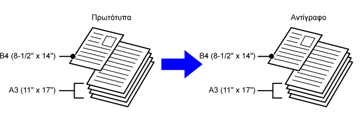 Χρησιμοποιήστε αυτή τη ρύθμιση όταν τα πρωτότυπα είναι σε 2 τύπους διαφορετικών μεγεθών και δεν έχουν πλευρές ίδιου μήκους. Η ρύθμιση αυτή μπορεί να χρησιμοποιηθεί μόνο για τους εξής συνδυασμούς μεγεθών: • A3 και B4 • A3 και B5 • B4 και A5 • A4 και B5 • B4 και A4R • B4 και A5 • B5 και A4R • B5 και A5 • 11"x17" και 8-1/2"x14" • 11"x17" και 8-1/2"x13" • 11"x17" και 5-1/2"x8-1/2"