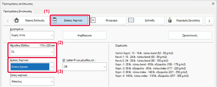 το μέγεθος και τον τύπο χαρτιού για εκτύπωση καθώς και το δίσκο