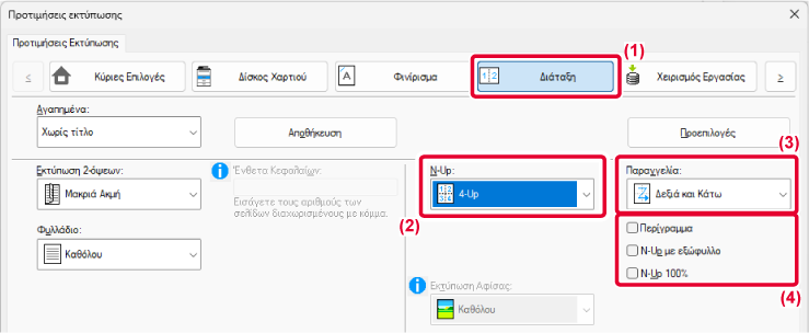 (2 σελίδες ανά φύλλο) ή [4-Up] (4 σελίδες ανά φύλλο), θα έχετε