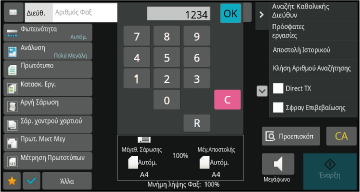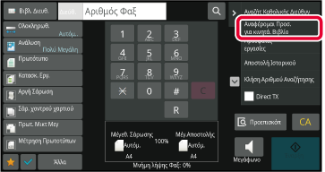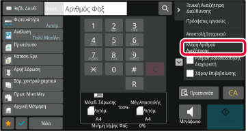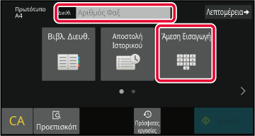 Πατήστε το πλήκτρο [Άμεση Εισαγωγή] ή το πλήκτρο [Αριθμός Φαξ] για να εισαγάγετε τον αριθμό φαξ του προορισμού.
