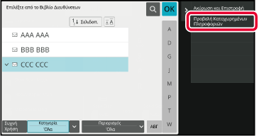 Στην οθόνη βιβλίου διευθύνσεων πατήστε [Προσθήκη Νέου] στον πίνακα λειτουργίας ή το εικονίδιο [Έλεγχος Διεύθυνσης] στη αρχική οθόνη.