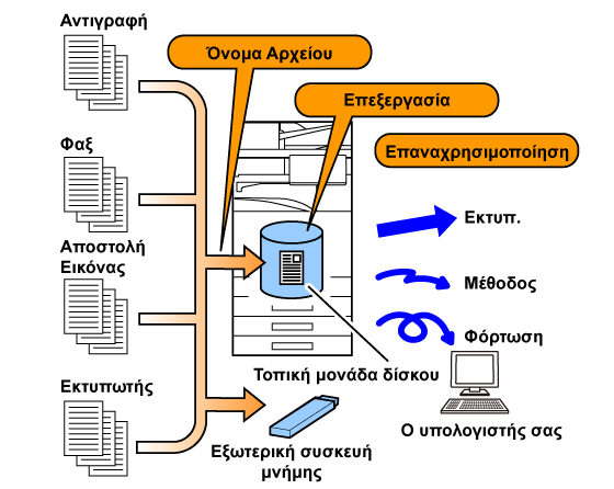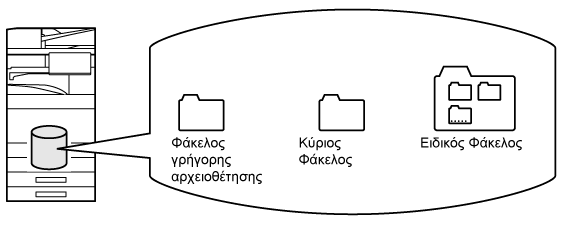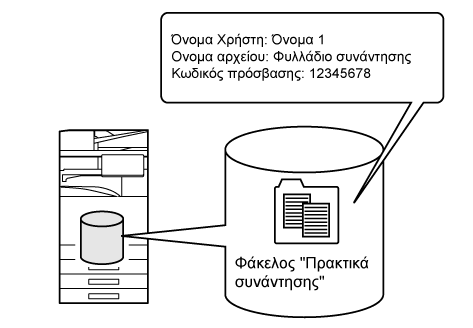 Κατά την εκτέλεση αντιγραφής, σάρωσης ή άλλης εργασίας, με τη λειτουργία αυτή τα δεδομένα των εγγράφων αποθηκεύονται στην τοπική μονάδα δίσκου. Σε αντίθεση με το Γρήγορο Αρχείο, κατά την αποθήκευση του αρχείου υπάρχει η δυνατότητα προσάρτησης πληροφοριών διάφορων τύπων, ώστε να είναι δυνατή η αποτελεσματική διαχείριση των αρχείων. Μπορείτε επίσης να ορίσετε κωδικό πρόσβασης. |