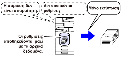 Κατά την εκτέλεση αντιγραφής, σάρωσης ή άλλης εργασίας, με τη λειτουργία αυτή τα δεδομένα των εγγράφων αποθηκεύονται στην τοπική μονάδα δίσκου. Χρησιμοποιήστε τη λειτουργία αυτή, όταν θέλετε να αποθηκεύσετε δεδομένα πρωτοτύπου γρήγορα και εύκολα, χωρίς να ορίσετε όνομα αρχείου ή άλλες πληροφορίες. Το αποθηκευμένο αρχείο μπορεί να χρησιμοποιηθεί και από άλλα άτομα. Μη χρησιμοποιείτε τη μέθοδο αυτή για την αποθήκευση αρχείων, τα οποία δεν θέλετε να χρησιμοποιούν άλλοι. |