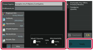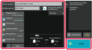Τοποθετήστε το πρωτότυπο στον δίσκο του αυτόματου τροφοδότη πρωτοτύπων ή στο κρύσταλλο πρωτοτύπων.Ελέγξτε το όνομα του αρχείου και το σημείο αποθήκευσης και πιέστε τα πλήκτρα για τυχόν ρυθμίσεις που θέλετε να επιλέξετε.