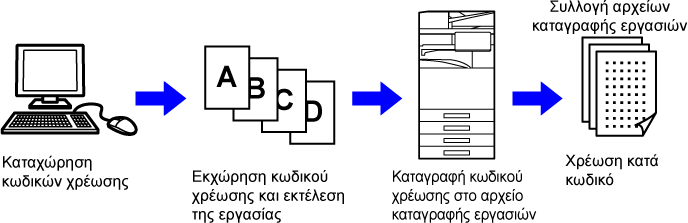 Χρησιμοποιείται για την ταξινόμηση των αποτελεσμάτων των εργασιών εκτύπωσης και αποστολής που έχουν εκτελεστεί, έτσι ώστε να είναι δυνατή η αποτελεσματική τους διαχείριση. Για παράδειγμα, μπορείτε να εκχωρήσετε έναν κωδικό κατά πελάτη και να συλλέξετε τις πληροφορίες δαπανών κατά πελάτη από τα αρχεία καταγραφής εργασιών. Παράδειγμα κωδικού: Έκδοση εταιρείας A |