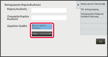 Κοινό προς Όλους: Καταχωρεί τον κωδικό χρέωσης ως κοινό κωδικό για όλους τους χρήστες του μηχανήματος.