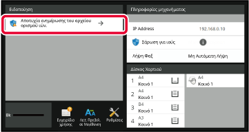 Η ενημέρωση θα ακυρωθεί και στην οθόνη αφής θα εμφανιστεί ειδοποίηση ότι το ενημερωμένο αρχείο είναι κατεστραμμένο. Αφού ο χρήστης επιβεβαιώσει το περιεχόμενο και κλείσει την οθόνη, το μηχάνημα θα λειτουργήσει με την έκδοση του υλικολογισμικού πριν την ενημέρωση. Αν η ενημέρωση του υλικολογισμικού έγινε εξ αποστάσεως, θα ακυρωθεί και οι πληροφορίες για την ανίχνευση ιού θα εμφανιστούν στις "Ειδοποιήσεις" στην οθόνη Πληροφορίες Συστήματος. Το μηχάνημα θα λειτουργήσει με την έκδοση του υλικολογισμικού πριν την ενημέρωση. |