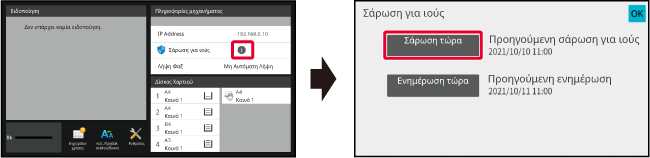 Όταν ανιχνευτεί κάποιος ιός στα εισερχόμενα δεδομένα, στην οθόνη αφής θα εμφανιστεί μήνυμα ότι έχει ανιχνευτεί ιός, τα εισερχόμενα δεδομένα ή η εισερχόμενη εργασία θα ακυρωθούν και τα εξερχόμενα δεδομένα ή τα δεδομένα της εργασίας θα απορριφθούν. Τα δεδομένα στην πηγή εισόδου δεδομένων (μνήμη USB, εξωτερικό διακομιστή κλπ) δεν θα διαγραφούν. Όταν ανιχνευτεί κάποιος ιός στα εξερχόμενα δεδομένα, στην οθόνη αφής θα εμφανιστεί μήνυμα ότι έχει ανιχνευτεί ιός, τα εξερχόμενα δεδομένα ή η εξερχόμενη εργασία θα ακυρωθούν και τα εξερχόμενα δεδομένα ή τα δεδομένα της εργασίας θα απορριφθούν. Το μήνυμα ανίχνευσης ιού θα εμφανιστεί στις "Ειδοποιήσεις" στην οθόνη Πληροφορίες Συστήματος. |