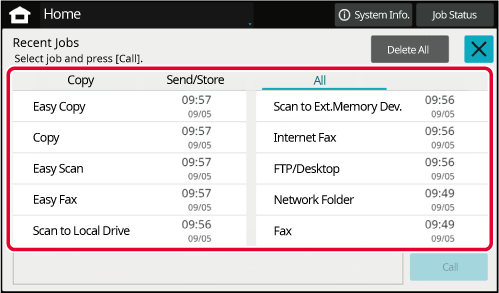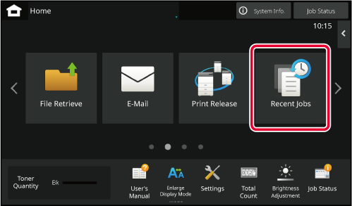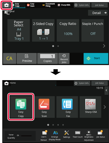 on the touch panel. The home screen displays the keys for selecting