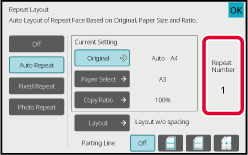 The maximum repeat count to copy images on a sheet is calculated automatically according to the original size, paper size, and copy ratio being selected from the base screen. |