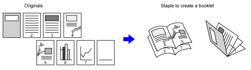 Place the original in the document feeder tray of the automatic document feeder, or on the document glass.Tap the [Others] key and then the [Booklet] key, or tap the [Staple Sort] key and then the [Saddle Stitch] key.
