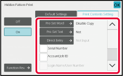 To specify print settings, you can select the required one from pre-set text or use the soft keyboard. You can also print serial number and account job ID.